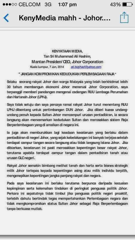 KALAU SULTAN BERNIAGA DAN MENJADI RAKAN PERNIAGAAN SYARIKAT ASING DAN SYARIKAT MILIK BUKAN BUKAN MELAYU yang menjalankan Pembangunan dan Perumahan di Johor, Adakah SELAMAT DAN TIDAK MERBAHAYA memberikuasa kepada Sultan melantik dan memecat Lembaga yang memantau dan berkuasa luas terhadap Pembangunan dan Perumahan di Johor?Saya percaya ianya sangat MERBAHAYA dan memudahkan pihak-pihak Asing mempergunakan Sultan yang merupakan Rakan Perniagaan mereka untuk menjalankan aktiviti "pembangunan" mengikut "selera mereka". Saya juga percaya MANA-MANA Orang yang dilantik menjadi Lembaga akan mengalami situasi "serba salah" dan "kesukaran" apabila berurusan dan berhadapan dengan Rakan Perniagaan Sultan di dalam melaksanakan fungsi mereka.Sultan Johor terlibat secara langsung dan Baginda juga mengakui secara terbuka bahawa banyak Syarikat Asing dari China dan Singapura serta tycoon berbangsa Cina menjadi Rakan Perniagaan Baginda. Hampir kesemua Pembangunan dan Projek Perumahan dengan pihak Asing berkaitan dengan Istana Johor. Pihak Asing telah mengenalpasti bahawa cara mudah "masuk" ke Johor adalah melalui Istana Johor.Saya menggesa agar kuasa melantik Lembaga diletakkan kepada Dewan Undangan Negeri atau Majlis Mesyuarat Kerajaan Negeri TETAPI BUKAN DITANGAN SULTAN JOHOR demi menjamin keadilan dan menyelamatkan maruah Negeri Johor.Ada beberapa Negeri lain yang ada Enakmen yang serupa tetapi tiada kuasa "MENGAWAL" LEMBAGA diberikan kepada Sultan. Memberi kuasa kepada Sultan secara mutlak adalah BERCANGGAH dengan Sistem Raja Berperlembagaan Malaysia yang digunapakai di Malaysia. Saya juga telah difahamkan bahawa idea "memberi kuasa mutlak" kepada Sultan timbul setelah Exco Perumahan dan Kerajaan Tempatan Johor ikut sama di dalam Lawatan Pribadi Sultan ke Negara China pada akhir tahun 2013. Penjelasan Sdr Latif Bandi tentang isu ini sangat tidak MENYAKINKAN rakyat.Saya ulangi GESAAN agar Rang Undang-Undang Lembaga Pembangunan dan Perumahan Johor HENDAKLAH DITOLAK demi Kedaulatan Negeri dan demi mempastikan bahawa pentadbiran Pembangunan di Johor dapat dijalankan secara telus dan adil. Banyak insiden sebelum ini tentang campurtangan Sultan di dalam urusan-urusan Kerajaan yang mana ianya dikatakan berada pada tahap "MEMBIMBANGKAN". JIKA "kuasa mutlak" mengawal Lembaga diberikan kepada Sultan, MAKA ianya akan menjadikan suasana ini berada di tahap "LUAR KAWALAN".KEADAAN INI BERBEZA JIKA SULTAN TIDAK TERLIBAT secara langsung dalam perniagaan berkaitan pembangunan/ perumahan seperti Sultan-Sultan Johor sebelum ini. Saya berharap Kerajaan Persekutuan dapat MEMBERI PERHATIAN terhadap kepincangan yang berlaku di Johor sekarang,SAYA JUGA DENGAN IKHLAS meminta Sultan Johor TURUN TAHTA dan memberikannya kepada warisnya yang LAYAK, jika Sultan Johor LEBIH BERMINAT MENJADI AHLI PERNIAGAAN MEMGUMPUL KEKAYAAN TANPA HENTI daripada menjadi Sultan SEPENUH MASA MENTADBIR NEGERI JOHOR DARUL TAKZIM.